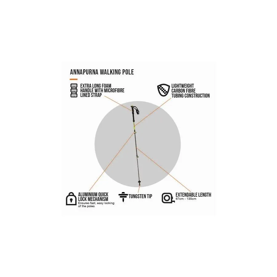 Το νέο μπατόν πεζοπορίας Vango Annapurna έχει σχεδιαστεί χρησιμοποιώντας εξαιρετικά ανθεκτικό, ελαφρύ σωλήνα από ανθρακονήματα για τις πιο απαιτητικές αναρριχήσεις. Η εξαιρετικά μακριά λαβή αφρού επιτρέπει πολλαπλές θέσεις στο χέρι και μέγιστη άνεση, ενώ η τεχνολογία QuickLock εξασφαλίζει γρήγορο και εύκολο κλείδωμα των πόλων.